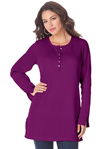 Our best-selling thermal henley plus size tunic is a quintessential piece for flattering layering, a look which is absolutely perfect for all of your social functions. this flattering top beautifully fits the bodice, creating a flattering waist and flows away at the hips to give a feminine hourglass figure alluring scooped neckline is generously cut to give you a fit that's flattering and flawless long sleeves fall right below the wrist for an effortless fit and cozy warmth the feminine full sleeve of this beautiful tunic creates a lovely, flowing shape that's ultra chic and comfortable slits at cuffs allow for comfortable movement and flow gracefully falling to about 32" the tunic sits right below your hips for a gorgeous silhouette stylish silver buttons make a subtle statement to this effortless tunic cotton/polyester machine wash imported wear with plus size denim or with a tee shirt underneath during the cooler months. Women's tunics, women's plus size tops thermal henley tunic, sizes S (10W-12W), M (14W-16W), L (18W-20W), 1X (22W-24W), 2X (26W-28W), 3X (30W-32W), 4X (34W-36W), 5X (38W-40W), 6X (42W-44W) This style tends to run large. For a better fit, we suggest ordering one size smaller. In Style Now!This thermal knit henley tunic is a must have! It is an essential top this season because it's perfect for layering, a timeless and effortless look.