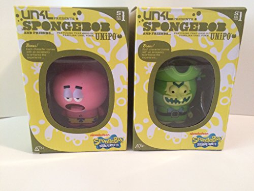 The UNKL Presents SpongeBob and Friends Assortment is a collection of four-inch vinyl figures featuring SpongeBob, Patrick, Squidward, Mr. Krabs, and The Flying Dutchman. Each figure is done in the style of UNKL's signature UniPo body design: little square bodies and slightly larger square heads. Each figure comes packaged with a trademark accessory. SpongeBob has a jellyfish net, Patrick comes with a jellyfish, Squidward has his clarinet, Mr. Krabs comes with a bag of money, and The Flying Dutchman comes with a sword. The figures also come with their own oxygen tanks, so they can breathe out of water while on your desk, nightstand, or shelf, of course.