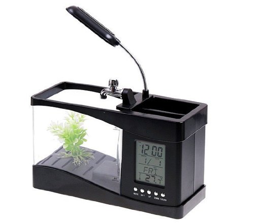 Quick Overview The USB LCD Desktop Lamp Light Fish Tank Aquarium is great for small fish. It is featured with LED light, decorative gravels, an artificial plant and a LCD for displaying clock, calendar, time, date, and temperature. Come with decorative pebbles, an artificial plant, and a USB connector. Features: - The water stored in the fish tank can be running circularly that fresh air can be provided for the fishes living in the fish tank. - Hold about 1.5L of water. - Adjustable overhead LED light and multicolor LED interior lights under water. - 2 switches are used for turning on/off the LED light and switching the water pump on/off. - 6 modes of tranquil nature sounds, like sounds of frogs, sounds of bird, sunds of water, etc. - Backlighting LCD display is featured with alarm clock, calendar, time, date, temperature, and snooze. - Dual compartment desk organizer or pen holder for setting pens, rulers, etc. - A great unique and unusual gift for your friends. Note: the moving water is powered by USB power. It will be running after you connecting the USB cable to PC. Specifications: Batteries: 3 * AA batteries (not included) for LCD USB Power: DC 5V for the Fish tank's pump and lighting LED light: 6 white LEDs and 2 colour-changing LEDs LCD display: Clock, Calendar, Alarm, Temperature Sounds: sounds of frogs, sounds of bird, sunds of water, etc Item size: 24 * 20 * 9.7cm Item wight: 705g Package including: 1 * USB Desktop Aquarium Fish Tank 1 * USB Cable 1 * Pack of Pebbles 1 * User Manual