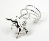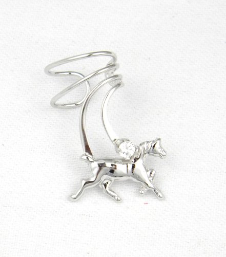 The sterling silver horse gallops its way across your ear on this beautiful ear cuff. Above the pony is a wave which is highlighted by a cubic zirconia. The waves follow the curve of your ear. Delightfully designed, the sterling silver horse on a wave ear cuff grips the edge of your right ear and does not need piercing to hold it.