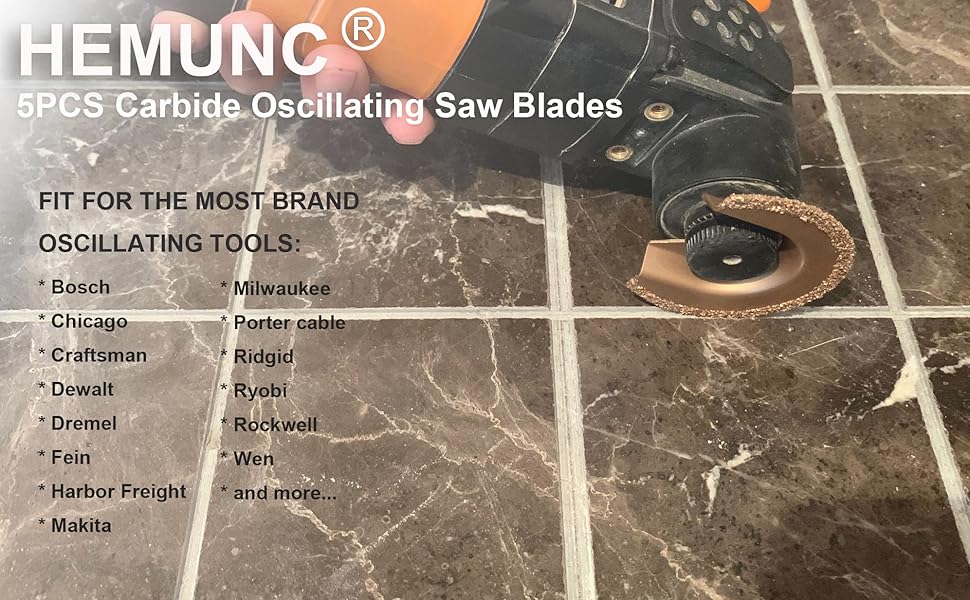 The HEMUNC 5-piece carbide oscillating tool blade set features three distinct blade shapes crafted from durable carbide for efficient cutting and grinding of tile grout, mortar, wood, and stone. Designed for universal compatibility with major oscillating tool brands, this kit is ideal for renovation pros and DIYers seeking reliable, versatile performance backed by responsive customer service.