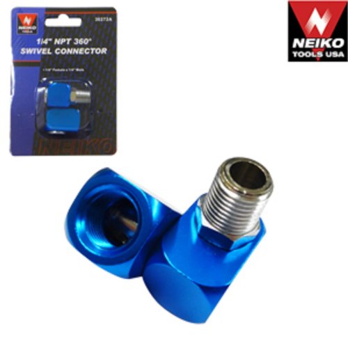 Specification * Aluminum construction, blue anodized * Swivels 360 degree at two pivot points allowing the air hose to drop directly to the floor while providing superb tool handling * 1/4" female NPT x 1/4" male NPT thread * Never kink air hosed again * Improves tool maneuverability and air flow, minimizes operator fatigue and extends hose life * For use with most air tools...grinders, sanders, glue guns, drills, buffers, etc.