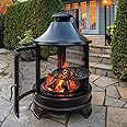 The Rustic Outdoor Fireplace Chimnea is a 32kg solid steel fire pit featuring a 3-position cast iron swing-out grill, 360° spark guard mesh, and a stylish satin black finish with bronze accents. Designed for outdoor use on non-flammable surfaces, it offers easy access with a hinged door and removable ash pan, combining rustic aesthetics with practical BBQ functionality.