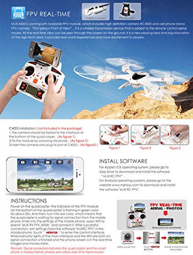 MJX X400 ready-to-use With C4005 FPV WIFI Real-Time HD Video Kits. Connect the Camera with your smart phone (supports Android or Iphone) via wifi and attach it to the quadcopter, enjoy High Quality real-time video transmitted back from the quadcopter.The MJX X400 model offers 3 different flying modes, beginner, intermediate and advanced extremely stable in beginners mode, very manoeuvrable in intermediate mode Or set it to advanced mode to do some barrel rolls! Description: Brand Name:MJX Item NO.:X400 Item Name:2.4G 6-Axis Gyro 3D Roll FPV RC Quadcopter Transmission Frequency: 2.4G Channel: 4CH Gyro:6-Axis Motor Type:Coreless Motor Transmitter:GR-246 R/C Battery: 7.4V750mAh LI-poly (included) Transmitter battery: 3 x AA 1.5V(Not included) Camera:C4005 FPV Wifi Camera Control distance:150M Charge time:2 Hours Flight time: 6~7 minutes Package Content: 1x MJX X400 RC Quadcopter 1x Transmitter 1x USB charger 4x Propeller 2x Skid landing 4x Protective cover 1x Screwdriver 1X C4005 FPV Wifi Camera 1X Battery 1x English User Manual