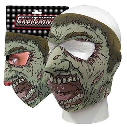Zombie Face mask-Skull Skins Face Mask on 100% polyester. Face mask is reversible to solid color black. Attached to neoprene rubber. One size fits most. Adjustable hook and loop closure on back. Has eye and nose opening and small holes for breathing. Great for motorcyclists, skiing, bitter cold winters, windy mornings and most snow conditions. FAST SHIPPING WITH A TRACKING NUMBER--RETURNS FOR DEFECTS ONLY