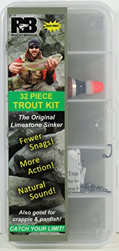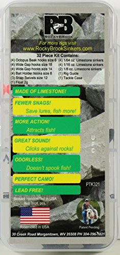Endorsed by some of the biggest names in professional fishing, Rockybrook sinkers are your only choice for natural-look, lead-free sinkers. The patent-pending design is handmade in the USA and comes in a variety of sizes and shapes. Since the sinkers are made from naturally occurring limestone, no two sinkers are alike. No other sinker on the market gives you camouflage in the water like Rockybrook Sinkers. Each Kit Contains: (4) Octopus beak hooks, size 6 (4) Wide gap hooks, size 18 (4) Wide gap hooks, size 14 (4) Bait holder hooks, size 8 (3) Snap swivels, size 12 (1) Float, 2g (4) 1/64 oz Limestone sinkers (4) 1/16 oz Limestone sinkers (2) 1/8 oz Limestone sinkers (1) Rig Guide (1) Tackle Case