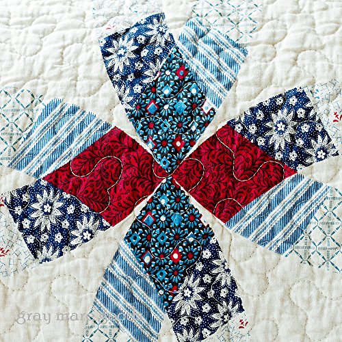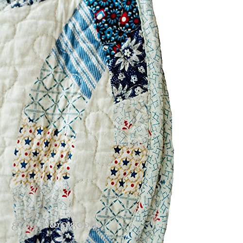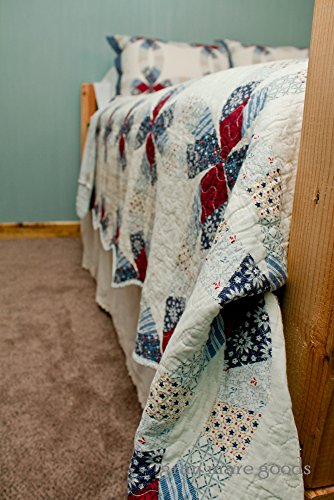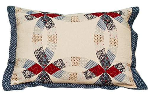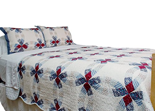 American Wedding ring quilts with patriotic colors of ivory, dark reds, blues and hints of yellow. Patchwork quilt pattern with plaids, stripes and florals replicating the authentic American wedding ring quilts of years gone by. These quilts are machine quilted cotton with microfiber backing for easy care and durability. The queen quilt is 90" x 90" and the standard shams are 21" x 27". Machine was and dry.
