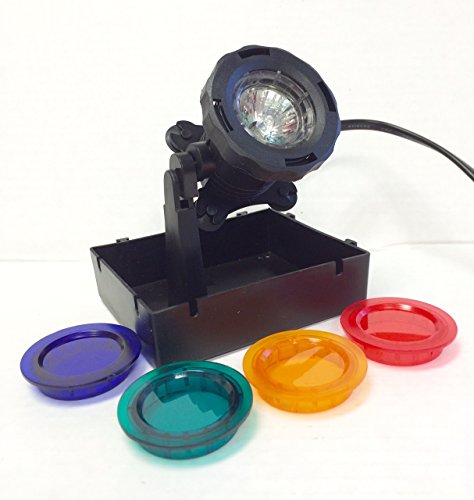 12 volt 20 watt Submersible halogen light with 20' cord. Light has adjustable base or can stand alone with optional colored lens for lighting effects. The PS-210 can be used in or out of water, out of water should not use colored lens. Great for fountains or ponds or landscape lighting.