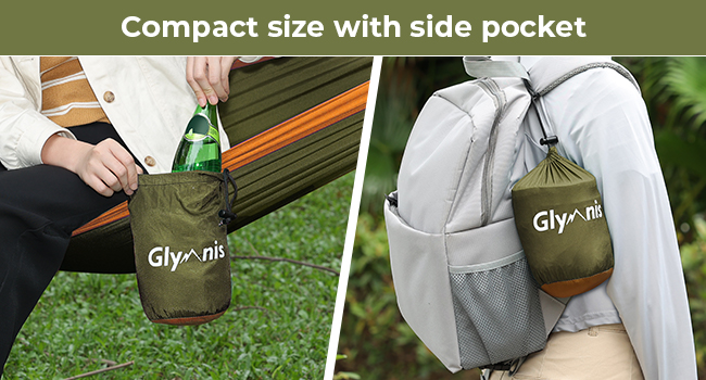 The Glymnis Camping Hammock is a lightweight, durable double hammock made from high-quality 210T nylon with triple-layer stitching, supporting up to 300kg. Measuring 275x140 cm, it comfortably fits two adults and includes upgraded black D-carabiners and straps for quick, tool-free setup. Perfect for camping, backpacking, beach trips, or backyard relaxation, it comes with a compact storage bag for easy portability.