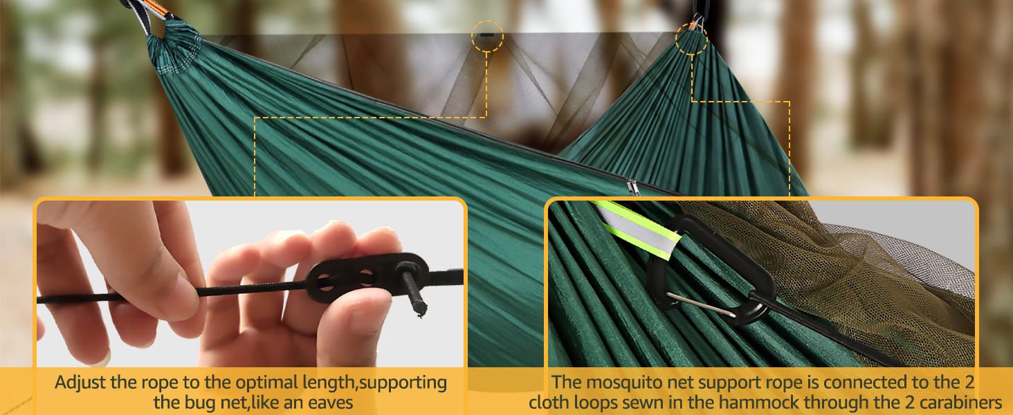 This hammock is lightweight durable and comfy it's elasticated over head line helps keep the bug net out your face if you are camping with this it does not come with a tarp for over head but overall I am very happy with the purchase I have camped in Scotland and England with this advised to get an under quilt if camping somewhere where it can be cold as under quilt gives a layer of insulation between you and outside elements without this in any hammock can get very cold