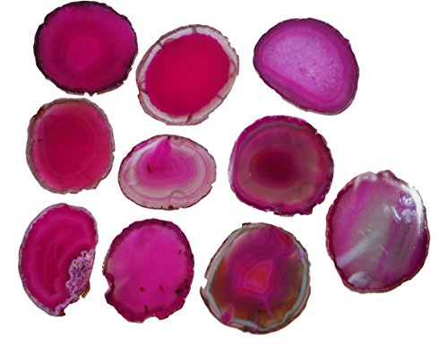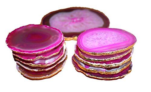 Pink Brazilian Agate Coaster shot glass set. 1-5" bottle coaster and 10-2.5" shot glass coasters in this beautiful set. You are getting the exact set in the photos. These Brazilian Agate Coasters have a beautiful 23K genuine golden edge. They have been carefully gold leafed with 23K GENUINE GOLD to achieve this rich beautiful look. Sealed to stay preserved and last a long time. They have protective rubber "feet" underneath so to not scratch furniture. Each Brazilian Agate is unique in shape and color with natural marbling, translucent and crystalline characters, and a couple in this set Druzy crystal centers. Gorgeous, magenta pink stone agate slices as pictured that have been gold leafed around the edges for a beautiful detail. Perfect Bachelorette Party gift! Great memory as they will last a long, long time!