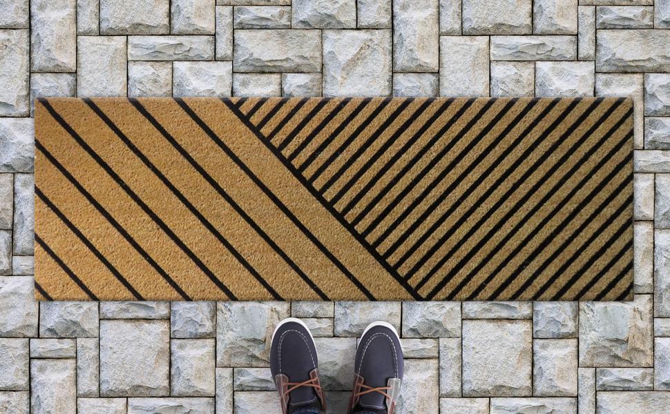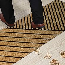 The ATMAH Coir Striped Doormat measures 120 x 40 cm and is made from 100% natural coir with a PVC backing. Its anti-microbial properties ensure a cleaner environment, while the durable design effectively manages dirt. Perfect for both home and office use, this stylish doormat combines functionality with eco-friendliness.