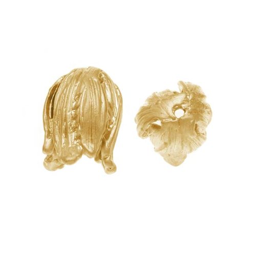 This bead depicts a detailed tulip top. This focal piece can be used as a connector/link in jewelry projects. The matte finish is soft and lovely with a lightly frosted appearance This pendant is made of lead-free pewter with a 16KT gold plating. A thin layer of nickel helps to bond the gold plating to the pewter base. Made in Korea. Approximate Measurements: 13mm long, 9mm wide, inner area is 5.5mm diameter. Hole is 2mm. Quantity: 2 Beads