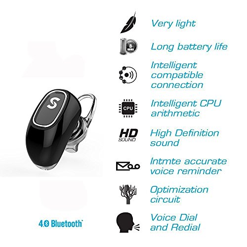Features: --Brand new and high quality. --Bluetooth wireless headset --Use A2DP Streaming Audio to listen to music --Blueooth V4.1+EDR --Stereo configuration,Pure stereo music --Long standby time:up to 150 hours --Transmission range: max 10 meters / 32fts --LED indicator --Can connect two cellphones simultaneously,and will not loss any calls --Suitable for all Bluetooth enabled device, Samsung, Motorola, Nokia, HTC, Sony mobile phones, iPhone, ipad, tablet PC. Specification: 1. Charging time:1-2 Hours 2. Continuous talk time:more than 4 hours 3. Protocol: Headset,Handsfree,A2DP 4. Transmission distance:10M 5. Transmission power:Class II 6. Frequency:2.402-2.480GHZ 7. Noise reduction,Ambient noise:90DB 8. Bluetooth version: 4.1 9. Support Agreement:A2DP+HFP1.5 What is included: 1 x Earphone 1 x Instruction 1 x USB Charger cable 1 x Wired earphone