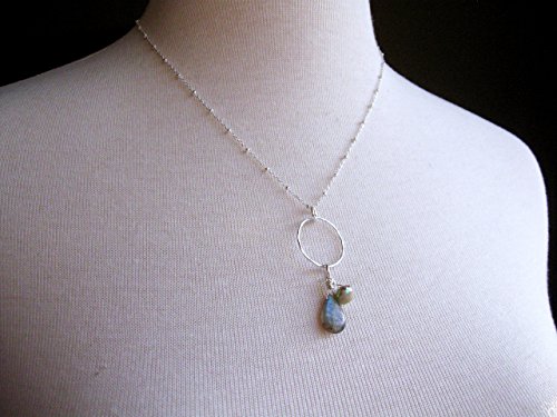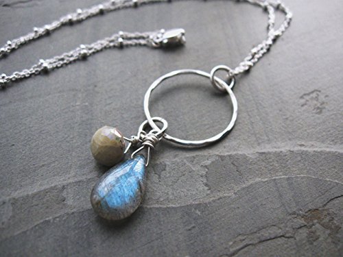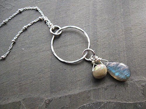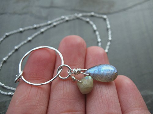 A gorgeous smooth labradorite gemstone briolette is the focus of this necklace. It has flashes of light blue typical of labradorite when the light hits it. Next to it is a small aquamarine gemstone briolette that is an almond-cream color with Aurora Borealis (AB) finish, giving it a beautiful iridescent sheen. The gemstones have been wrapped by hand with sterling silver wire. They are attached to a hand-hammered sterling silver circle and hang from a sterling silver satellite chain. [Circle is 3/4 inch in diameter. Labradorite gemstone is 5/8 inch long.]