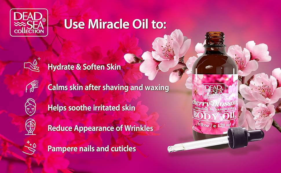Dead Sea Collection Body Oil is a 4 fl.oz moisturizing elixir enriched with Vitamins A, E, and D, designed to enhance skin elasticity, promote collagen production, and provide anti-aging benefits. Infused with a captivating cherry blossom scent, it comes in an eco-friendly dropper bottle for precise, waste-free application, making it a luxurious yet sustainable choice for dry skin care.