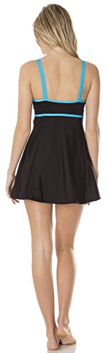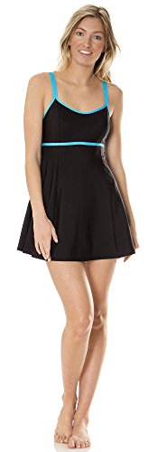 Experience a flattering fit and a flare silhouette. A Powernet tummy control panel smooths and flattens the waist, starting just below the bust line and ending at the upper hip line. Princess seams break up and visually slim the torso, with a side seam that measures 21" from underarm to hem. This swimdress hides hips while minimizing rear and thighs, while the built-in, wire-free molded cup bra and scoop neck with non-adjustable, double lingerie straps provide moderate coverage, supreme comfort, and bust support. A full one-piece matching print suit underneath completes the swimdress. Sizes 8-16 fit up to a C/D cup, while sizes 18-34 fit up to a D/DD cup. The swimdress fits true to size, with material consisting of 82% Nylon and 18% Spandex. To clean, this suit should be hand washed in cold water with mild soap (no bleach). Do not wring out, simply lay flat to dry. Do not iron.