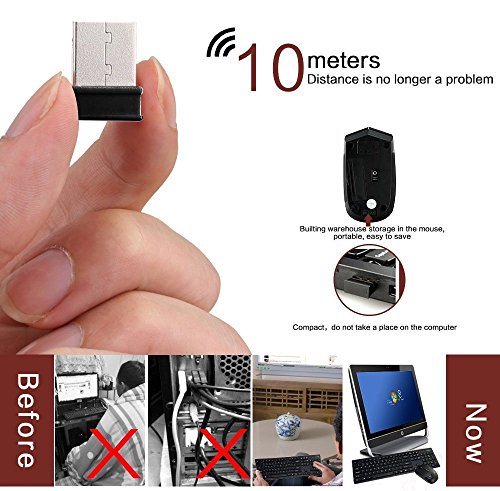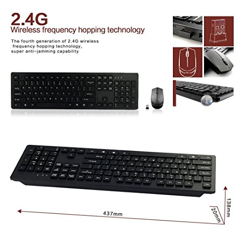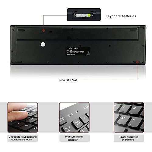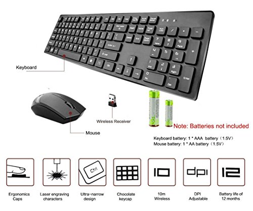 Specification: 2.4G wireless optics keyboard and mouse Decent and modern design No need to install Keyboard and mouse auto sleep mode Wireless receiving range up to 10 meters Compatible with laptops/desktops/intelligent televisions Keyboard size: 437mm * 138mm * 20mm Mouse size: 105* 55 *40mm Keyboard battery: 1 * A AA batteries (not included) Mouse battery: 1 * AA batteries (not included) Highlights: Advanced 2.4 GHz wireless: Work or play in more places. The wireless connection virtually eliminates delays, dropouts and interference and gives you a range of up to 10-30meters range.(Wireless range may vary due to environmental and computing conditions). Eight shortcut keys: Instant access to media controls-movies, music, Internet, e-mail, play/pause, volume and more-are one touch away. Full-size keyboard: The full-size keyboard with number pad, directional keys, and nine F-keys is comfortable, convenient and built to last. Compact mouse: Take the mouse with you. This comfortable mouse fits easily into computer bags and pocket to travel with your computer. Three ultra power-saving mode and intelligent power design, power off the receiver, and automatically turns off the keyboard, mouse, power supply. Package Contents: 1 X E-More C100 Wireless Keyboard 1 X USB Wireless Mouse 1 X USB receiver