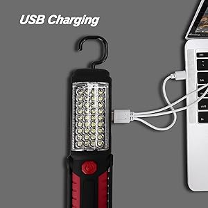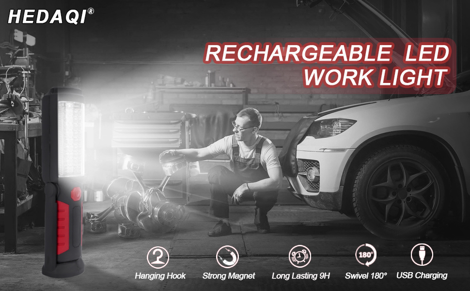 This rechargeable, waterproof LED work light features a powerful 240-lumen output with 36+5 LEDs, a 360° magnetic swivel base for hands-free use, and a durable aluminum alloy build. Compact and lightweight, it offers up to 9 hours of continuous illumination on a single 3-hour USB charge, making it perfect for professionals tackling car repairs, emergencies, or household projects.