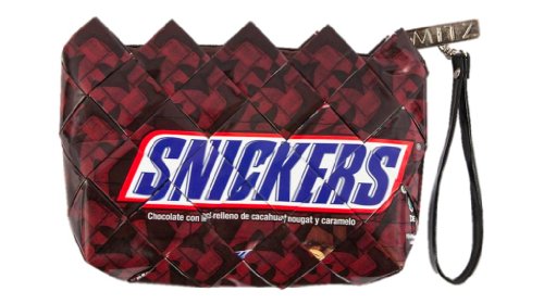 Perfect for your camera, cell phone, keys, coins or other compact essentials. All handmade and one of a kind. Durable, water resistant & self lined. This colorful clutch will complement your eco-fashion conscious lifestyle. Made from excess Snickers candy wrappers. Limited editions.