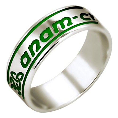 925 Sterling Silver Plated Celtic Ring with Green Enamel Celtic Script Mo Anam Cara design. Mo Anam Cara translates into English as My Soul Mate. Pronounced, Muh Onum Kara. Its a classic piece that makes a welcome addition in any stylish collection of tasteful jewelry. This item has been e-coated which gives a high quality finish and prevents oxidation, tarnish, allergic reaction and scratches with normal usage. Also available in black, blue, plain and red script. Also available in brass. Check in my shop for details.
