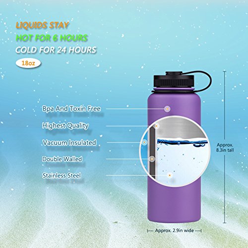 THE HEALTHY CHOICE: Vacuum-sealed, double-wall stainless steel, the Vatna Insulated Stainless Steel can keep your hot drinks warm or keep your cold drinks chilled for over 12 hours. Due to the perfectly vacuum insulated construction, the bottle does not sweat when filled with ice water or burn your hand when filled with hot water. The outside of the bottle will stay cool and dry and gives you a comfortable grip all the time. Made from food-grade 18/8 stainless steel, this bottle is free of toxic chemicals like BPA, lead, phthalates and other harmful substance. The stainless steel material does not retain flavors, so your drinks will stay palatable and fresh for a whole day. Light weight and slim design make the bottle easy to carry and allows the bottle to fit into most car cup holders, so whether you're outdoor playing sports, or sitting behind a desk, or having a long drive in your car, this bottle is a perfect choice for you to stay hydrated. Features: 1.Outdoor camping picnic tools. 2.Stylish portable accompanying cup. 3.Stays hot up to 12 hours; stays cool up to 24 hours. 4.BPA-Free, Double wall 18/8 stainless steel water bottle with vacuum insulation. 5.Wide mouth for easy refills and allows for ice cubes to be put in. 6.High quality colorful powder-coated matte finish exterior that never sweats. 7.Lightweight Fits Most Cup Holders; Perfect for Hiking, Camping, Backpacking. 8.With its multiple fantastic colors the Vatna Stainless Steel Flask makes the perfect gift for parents or just about anyone.