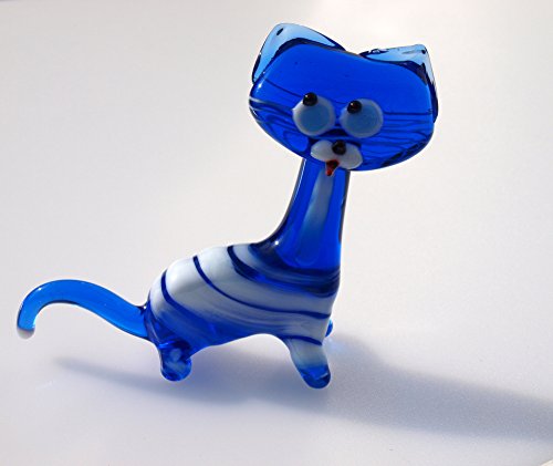 Cute cobalt- blue color Glass Cat, collectible figurines and Statues, lots of character, details and personality and outstanding features. Totally hand made by Flame work technique. High craftsmanship skills involved. Unique glass animal sculpture. This figurine may be placed outside: weather proof. Size approximately 4 inches H. (1 inch = 2.54 cm) Great Art Glass Gift which makes you smiles.