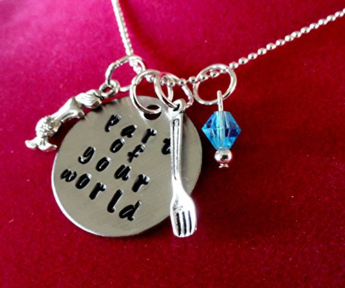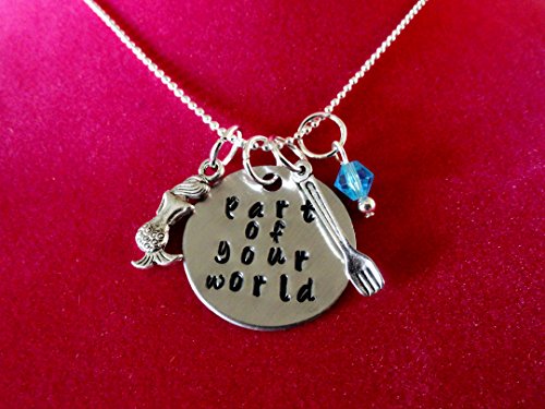 A little mermaid necklace for any fan! This little mermaid necklace comes hand stamped with "Part of your world" on a beautiful 1" non-tarnish silver aluminum disc (not the brushed one that is shown). It comes with a mermaid charm, a fork charm (dinglehopper), and a 6mm blue crystal bead. It comes with your choice of chain, 18" ball chain as shown, or also available in silver plated textured link chain. Please choose chain length if going with the link chain.