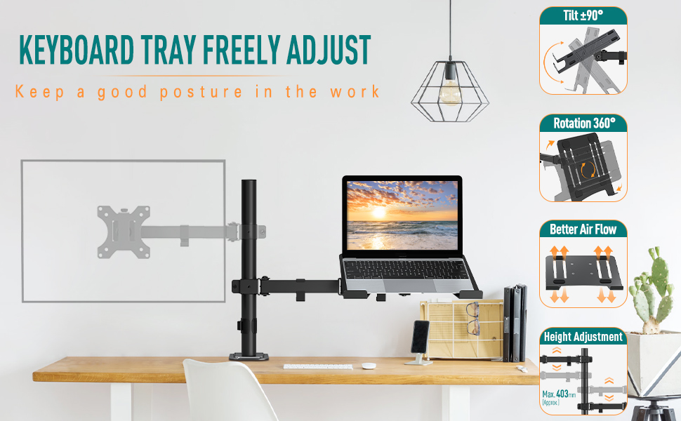 The ELIVED Monitor Arm with Laptop Tray is a versatile and ergonomic solution for managing your workspace. It accommodates monitors from 13 to 32 inches and laptops up to 17 inches, featuring adjustable height and angles to enhance comfort. With dual mounting options and a space-saving design, this monitor arm is perfect for professionals seeking an organized and efficient work environment.