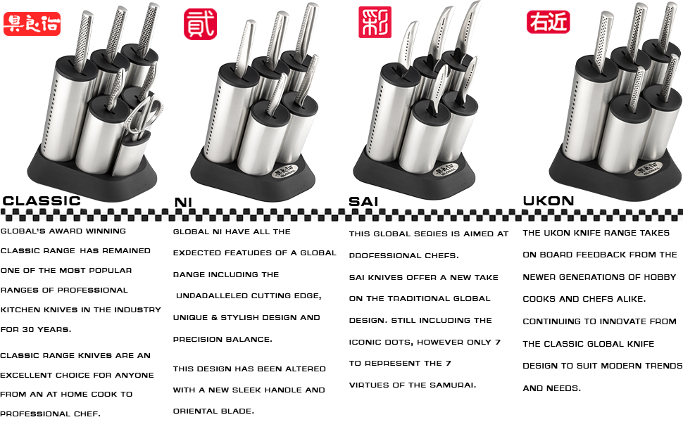 I did not buy my Global Knives from Amazon, however leaving a review here for those interested in buying them. For sure, these knives are very expensive. However, they are a joy to use for anyone interested in food prep. Unless you've used truly sharp knives to cut food and meat before, it is difficult to explain just how much easier these superb knives make EVERYTHING. They cut effortlessly through almost ANYTHING edible. They are so incredibly sharp it just makes preparation of food so much easier. They are weighted beautifully.I cannot recommend these knives highly enough. If you're sitting on the fence about spending so much money on some knives, I urge you to go for it and treat yourself to them. They will last a lifetime if properly looked after. They must not be put in the dish washer. Just a wash with soapy warm water and a quick dry with a T-towel is all that is needed and an occasional sharpen with the - also superb - Global Knife sharpener.