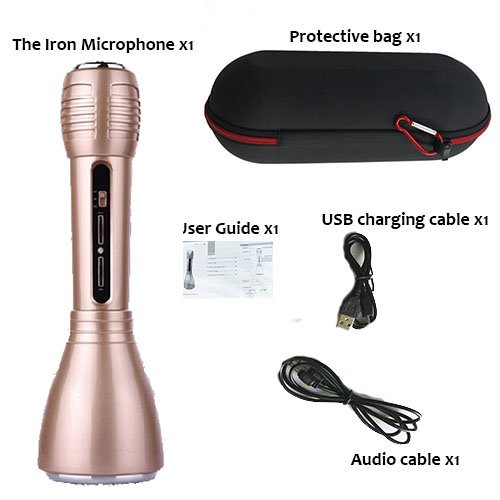 Features: -Wireless Connection: You can connect with your phone with cable or Bluetooth. And turn on the singing software on your phone or on your computer. In this way, beautiful voice will come from the speaker. -You can practice singing, listen to music without going to KTV. Specification: Sound pickup: Capacitive sound pickup Speaker Power: 3W Maximum Sound Pressure level(SPL): >115dB Frequency: 1KHz Degree of Distortion : <1% Input Voltage: DC5V Battery Capacity: 1000mAh polymer lithium battery Charging time: 3 hours Working time:3-5 hours Speaker size: 4cmx21cmx3cm Color:Rose gold,Rose red,Gold (Optional) Notes: (1)Bluetooth can be connected automatically after first match. (2)If you only need to listen to music,just switch to 'BT' mode Package List: 1 * Microphone 1 * USB charging cable 1 * Audio cable 1 * User Guide 1 * Protective case **If you cant connect the Bluetooth well,you can charge the microphone battery full and try it again!** **When charging,the red light would have been shining.This is a normal reaction** **Our Items do not have sound recording function** Our product have two mode.One is "BT"mode which is speaker and one is "MIC"mode which is Karaoke mode. About"BT"mode: After connecting the device (For example:Phone) ,speaker(BT Mode)'s volume is adjust on the phone. So we recommends that customers can try to tune the volume on phone. About"MIC"mode: MIC mode(Karaoke Mode)'s echo adjustment and people sound volume are adjust on our product directly. but the music volume is still adjust on phone.