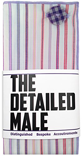 White pocket square with purple and light red stripes, a light purple tightly serged edge and a clear and purple gingham plastic button. Ideal for weddings, the office, date night...Perfect every single day! This pocket square adds an excellent pop of color to any outfit! Never leave home without the perfect accessory tucked into your pocket. Need a custom accessory? Send us a message! All products handmade in the USA. Cotton/ Plastic. Approximately 11 1/2" x 11 1/2". Hartford Pocket Square. All pocket squares are customizable- Just let us know exactly what you need! Find the lapel flower pin in the Lapel Flower Pin section of The Detailed Male.