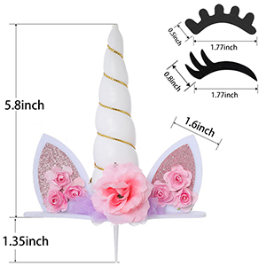 This 5.8-inch handmade unicorn cake topper features a soft felt white horn, ears, and 7 matching flowers, complemented by 4 pairs of eyelashes for a vivid look. Crafted from non-toxic materials with a food-grade plastic stake, it’s safe for kids and perfect for decorating cakes up to 12 inches, making it an ideal reusable accessory for birthdays, baby showers, and more.