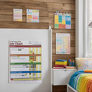 SHAPES ETC. Child Organizer Job Chart offers 50 sheets of 8.5x11 inch customizable chore charts designed to promote responsibility, positive reinforcement, and good habits in kids. With categories for self-care, school, and household tasks, plus space for rewards and allowances, this USA-made product helps parents foster independence and motivation in children through a fun, visual daily task tracker.
