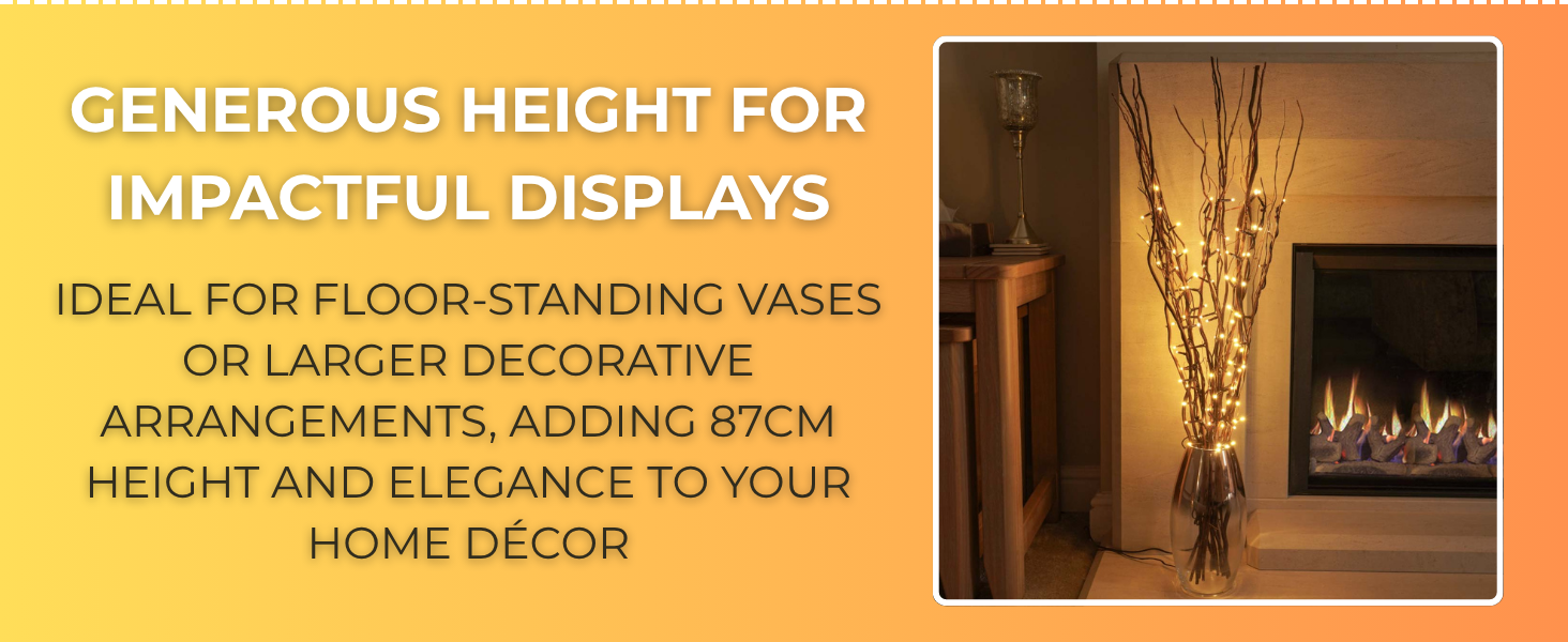 These Festive Lights feature 5 flexible brown willow twig branches, each 87cm tall, adorned with 50 warm white LEDs powered by a 2-meter plug-in cable. Designed for indoor use, they offer a natural, elegant glow that enhances any room’s ambiance without the hassle of batteries. Perfect for vases, tables, or decorative displays, they combine rustic aesthetics with modern convenience and come with a 12-month warranty for reliable, long-lasting performance.