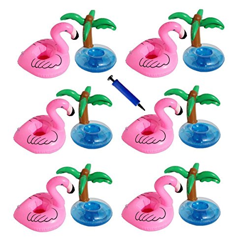 Description The luau party supplies and favors are fun for all ages! Be sure to offer your guests fun and favors to take home with them! The inflate floating drink holder is sure to be a hit in your luau party goody bag. The coconut palm tree shaped inflates with center ring for drink can, and floats in the water! A must have Hawaiian party favor for tropical theme events like Hawaiian Luaus, corporate parties, beach, weddings and more! Features - Color: As the picture shown. - Material: PVC. - Size: About 90 * 90 * 80 cm/ 35.4 * 35.4 * 31.5 inch(L*W*H). - Great for keeping your drink handy in the pool. - Specifically designed bottom to protect the floatable drink holder from sliding away when putting on the smooth place. - Conveniently float your drinks in style with the Palm Island Drink Rafts. - More convenient for you to put your coke, soda, beer, fruit juice on it. - Keep away from fire, nice for Hawaiian luau, tropical themed parties! Size: Flamingo:18cm*18cm Palm Trees:25cm*21cm Package Includes: 6 * Flamingo Drink holder 6 * FlamingoPalm Trees Drink holder Palm Tree Inflatable Pool Drink Holder with Pump Swimming Bathroom Beach Pool Party Decorations 1 * Mini Air Pump(18cm)