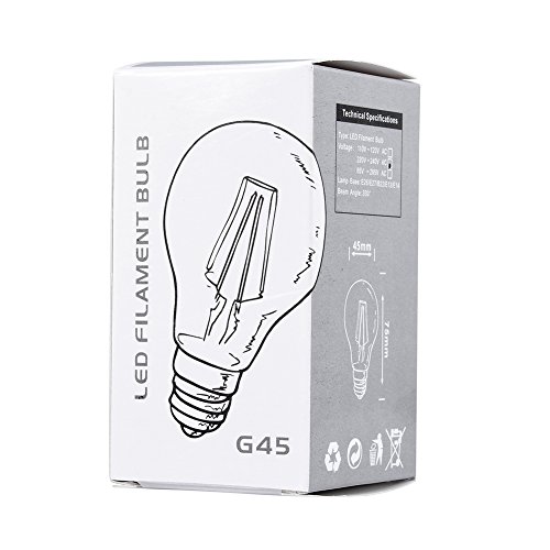Brand:yaoten Model:YT-G45-5 Power:4W Bulb type:LED bulb Filament count:4 pcs Luminous flux:400LM Luminous efficacy:100LM/W Color temperature:2700K Indicator:80 Ra Voltage:230V Base:E27 Certification:CE ROHS Incandescent Equivalent:40W Whether dimming:Dimmable Lifetime :30000 hours Startup:Moment Material:Glass Bulb Color:Clear Light Bulb Size:120mm*35mm Packing quantity:5 pcs