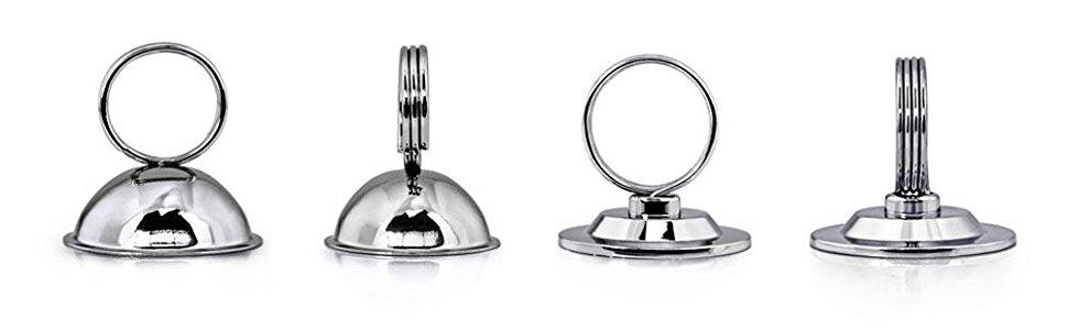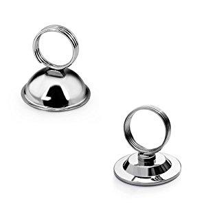 The New Star 23398 Mirror Chrome Finish Table Menu Card Holder is a set of 12 durable zinc alloy holders, each measuring 2.25 by 2.25 inches. Designed with a secure ring clip, these holders are perfect for weddings, banquets, and professional events, combining functionality with a sleek, mirror chrome finish that fits effortlessly into any decor.