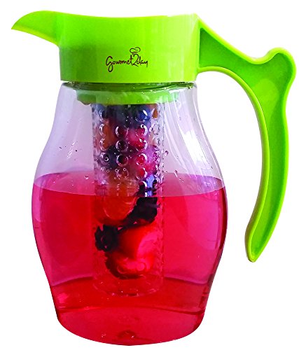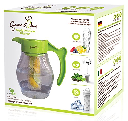 Enhance the flavour of water, tea, punches, cocktails and other beverages with the Gourmet2day Triple Infusion Pitcher. Unique product design includes 1 Pitcher and 3 interchangeable infusers: -Premium quality, impact-resistant Tritan plastic pitcher with anti-spill locking lid. -Fruit and herb infuser - to enhance the flavour of water and other beverages. -Stainless steel loose leaf tea infuser - can be used for hot or cold brewed tea. (ensure boiled water settles for 30sec in kettle before pouring into pitcher) -Ice infuser - chill core to keep your beverages cool, without diluting the flavour. Great way to detox and improve overall health by consuming more water in your diet with enhanced fruit / tea flavors. Key benefits and features: -Perfect for entertaining guests with large capacity 3QT (2.8LTR) pitcher and attractive design. -Ideal for gifts - quality product and appealing packaging design. -Pitcher is made from high quality, impact-resistant Tritan plastic - unlike many other low quality plastic pitchers that are available. -Product is made from BPA free material, therefore there are no harmful toxins. -Pitcher can be easily stored inside refrigerator door. Dimensions: Height = 27.5cm x Width = 25.5cm x Depth = 10.6cm. -Simple to use with instructions included on our packaging. -Dishwasher safe. Amazon buyers trust Gourmet2day for our quality products and service. Plus you are backed by our lifetime warranty. Click "Add to Cart" now.