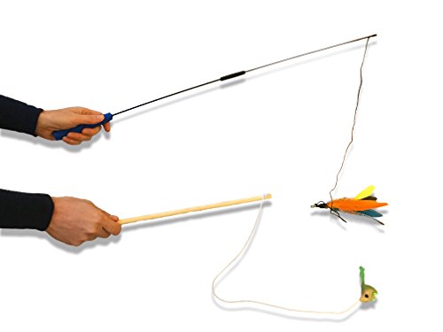 Are you looking for imaginative, interactive fun toys to tickle your cat’s fancy? Do you love watching your kitten’s natural cat instincts as he or she wiggles and stalks, pounces and captures the toy mouse? We know our favorite feline cats are fascinated by everything that moves, and by everything that looks like a mouse or a bird! Now you can simulate the flight of a bird or scurrying mouse with just the flick of a wrist with this 2-pack of cat teaser toys! One is designed with a solid wooden handle, with an attached heavy-duty line like a fly-fishing rod with a colourful stuffed mouse dangling from the end! The other cat wand is made from a fiberglass rod with moulded handle, and has a detachable fastener and feathered tickle toy “lure” at the end. The detachable fastener allows you to remove the mouse and add another of your kitty’s favourite toys for playtime! When you’re done laughing at the cat and mouse fun, and your favourite feline has gotten lots of exercise, these cat toys store neatly, safely, and out of sight until the next time! This pet toy is the perfect choice for a gift for your family cat lovers, and will give them, and their kitty, hours of fascinating fun! We know you’re going to love this 2-pack of cat teasers, so click “Add to Basket” now! Warning! This toy is not suitable for small children due to small parts. It is a choking hazard and children should be supervised at all times. Please see our Terms & Conditions.