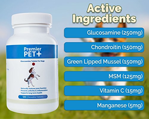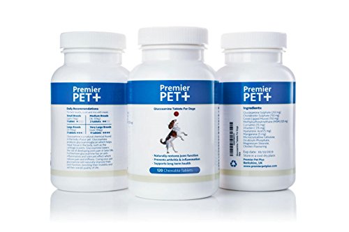 Premier Pet Plus glucosamine We know that your dog isn't just another house hold pet, they are part of your family. Because we feel the same way, nothing is more important to us than providing your dog with a quality supplement that is formulated for the best possible results. Even if your pet doesn't suffer from any joint pain issues, you can stop them from ever happening. By simply adding glucosamine as part of their regular diet, you can keep those joints healthy for a lifetime. Our dog joint supplement has carefully selected ingredients for the most effective results. Glucosamine is crucial for the repair of tissue in the joint. Whilst providing a lubrication effect, this will improve your pet's joint function naturally aiding their overall mobility. Green Lipped Mussel contains a rich source of omega fatty acids, minerals and natural chondroitin all of which will aid in maintaining healthy cartilage and joints. Manganese will aid your pet's digestive health, absorption of calcium and regulating of blood sugar. This is an essential mineral for your pet's well-being, young and old. Hyaluronic Acid will act as a cushion, lubricating the connective tissue around the joint. In addition to this it will also aid your pet's flexibility, particularly in older dogs. Vitamin C will fight off illness and promote a quicker recovery. This will also help uphold structural protein in the connective tissue around the joints. Our daily recommendation and how long your bottle will last: Up to 15KG - 1 tablet (120 days) 16 - 30KG - 2 tablets (60 days) 31 - 45KG - 3 tablets (40 days) Over 45kg - 4 tablets (30 days) Don't wait until your furry friend has joint issues, buy now and stop it from ever happening!