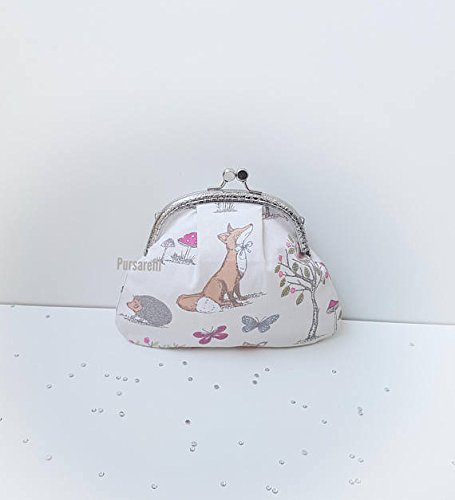 Big purse/make up bag/clutch with woodland print on cream fabric. With a round silver style ornate kiss lock clasp, and fully lined and with ribbon detail inside, the frame is hand stitched to the purse for extra durability and strength. With slightly expanding sides, this size purse can hold change, lipsticks, keys, mints, credit cards, debit cards, tissues and more...all at once! Fill them with anything you need, use them for shopping, work, evenings out, holidays, they truly are small and mighty! Made from cotton and a clasp, the measurements are: Width 16 cm, height 15 cm (6.5 x 6 inches). All items by Pursarelli are handmade in the UK, in a smoke free, pet free environment. What you see is what you receive, we never put a generic photograph on and state pattern may vary.