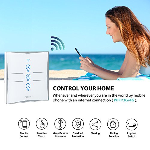 Voice Control Edit a name to each Smart Wall Switch and communicate each switch by this name when making a voice command. You can also create a group for all your smart devices and control them all in one command. Control Remotely Turn your lights, ceiling fans, and other fixtures off and on no matter where you are. On a warm day, you can turn on your ceiling fan before leaving work so you can come back to a more comfortable home. Set Schedules Use the Smart Switch to automate connected fixtures based on your daily schedule and preferences. The smart switch can even adjust automatically to changing sunset and sunrise times. Easy to use Control your fixtures from anywhere using the E-WeLink app for iOS and Andriod, no hub required. 1.Install the Smart Wall Switch as easily as a traditional light switch. (Requires a neutral wire) 2.Download the free App via scan QR code or get on APP store, Android Market or Google Play. 3. Connected your home wifi and paired with the App. Specification Color:3 Gang Rated Current:10A(Max) Rated Voltage:AC100V~240V(50-60Hz) Rated Power:1800W Working frequency:2.412~2.484MHz Static power loss:≤0.3W Working Temp:-20゜C~75゜C Humidity: Lifetime: One million Dimensions:86x86x32MM Unit weight:150g Note: 1.This product should be installed by trained electricians. Please follow the basic electrotechnical security principles. 2. Neutral wire is required.