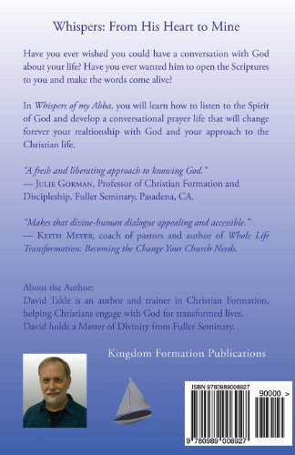 Have you ever wished you could have a conversation with God about your life? Have you ever wanted him to open the Scriptures to you and make the words come alive? In "Whispers of my Abba," you will learn how to listen to the Spirit of God and develop a conversational prayer life that will change forever your relationship to God and your approach to the Christian life. ""Clear and simple instructions on entering and abiding in real life interaction with God"" -- Dallas Willard