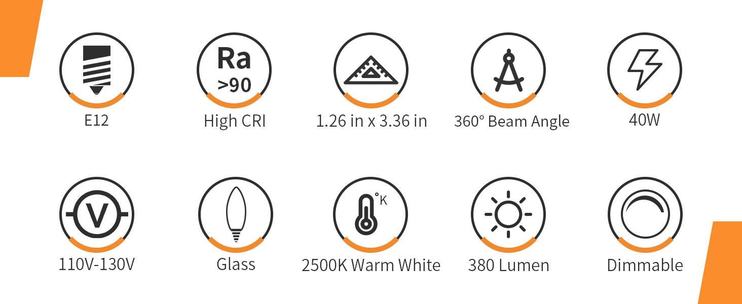 | Special Features | ★2500K Warm White ★ 380 Lumen ★ 40 Watts ★ B10 ★ E12 Base ★ High CRI 99+ ★ Dimmable ★ 1500+ Hours Lifespan ★ Instant On ★ Flicker-free & Noise-free ★ No radiation, No pollution, No lead or mercury ★ Original Brightness ★ Anti-Stroboscopic ★ Tech Safe Packaging |