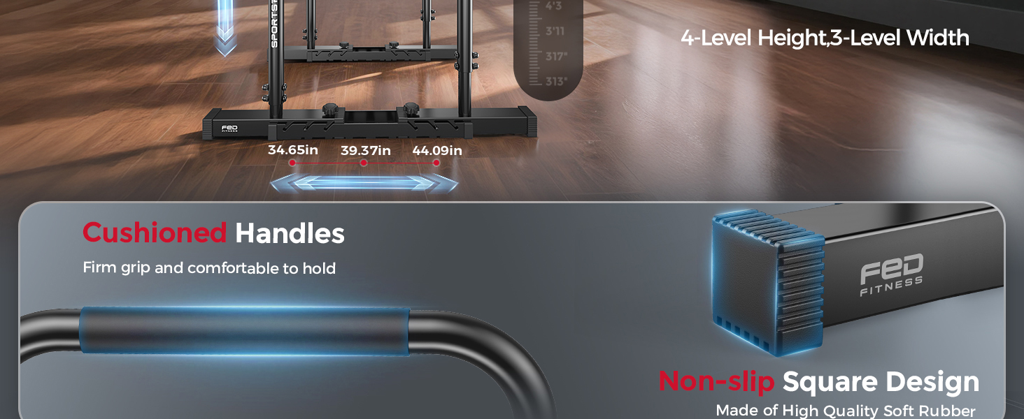 The Sportsroyals Dip Bar is a versatile and durable adjustable dip stand designed for home workouts, featuring a heavy-duty construction that supports up to 400LBS. With customizable height settings, easy assembly, and non-slip grips, it's perfect for a variety of upper body exercises. Backed by a one-year warranty, this dip station is your go-to for effective calisthenics training.