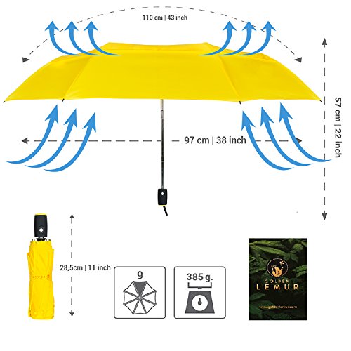 With GOLDEN LEMUR Umbrella you will have the satisfaction of having an elegant folding, durable, quality umbrella, and also you will be protected on rainy days! DESIGNED FOR A LONG-LASTING LIFE GOLDEN LEMUR's umbrella is a compact lightweight umbrella made from high strength materials and durable alloys. Its central stainless steel structure with 9 rods of carbon fiber, highly water- resistant fast dry fabric 210T with Teflon DuPont and its opening and closing mechanism, are guarantee for a 100% reliable automatic umbrella. SIMPLE AND SAFE It was designed for and easy and safe handling. This folding, automatic umbrella can be opened quickly and efficiently at the press of a button. The closing can be performed in two simple steps to avoid accidents. By pressing the button again, it will be partially closed and just the telescopic shaft has to be closed manually. TOTAL PROTECTION The open umbrella is 38 in/97cm in diameter, and can cover up to two people. With a waterproof fabric of a high quality, a robust construction, and a windproof system, you will walk pleasantly on the rainiest days. CLASSICAL MODERN ELEGANCE Black umbrellas with an elegant and classic design that will protect you all the time. Take it with you everywhere in your briefcase or work bag, in your purse, in your car's glove compartment. The large ergonomic wooden like soft handle makes it look classy. This is a compact travel umbrella with the quality and robustness of a large umbrella. It comes with a light cover that will help its transportation. Do not hesitate, both for professional or personal use, or as a gift; you will be satisfied with your choice. Put an original umbrella GOLDEN LEMUR in your life!