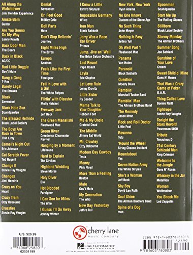 Over 90 rockin' hits of yesterday and today, in note-for-note transcriptions with tab.All Along the Watchtower - Amsterdam - Are You Gonna Go My Way - Back Door Man - Back in Black - Bad Little Doggie - Bang a Gong - Barely Legal - Black - Black Hole Sun - The Blessed Hellride - The Boys Are Back in Town - Camel's Night Out - Cat Scratch Fever - Change It - Changes - Crazy on You - Crazy Train - Crossfire - Denial - Dr. Feel Good - Doll Parts - Don't Stop Believin' - Eight Miles High - Europa - Feels Like the First Time - Fell in Love with a Girl - Flirtin' With Disaster - Freeway Jam - The Green Manalishi - Green River - Hanging by a Moment - Hard to Explain - Highland Wedding - Holy Diver - Hot Blooded - I Can See for Miles - I Guess I'll Go Away - I Know a Little - Impossible Germany - Iron Man - Jerry Was a Race Car Driver - Jump, Jive an' Wail - Last Resort - Layla - Let Love Rule - Little Sister - Mama Talk to Your Daughter - Me & My Uncle - The Middle - Mr. Crowley - Modern Day Cowboy - Money - More Than a Feeling - Mule - My Generation - New Day Yesterday - New York, New York - No One Knows - No Such Thing - Nothing Is Easy - Oh Well Part 1 - Panama - Question - Ramblin' - Ramblin' Man - The Remedy - Rock and Roll Doctor - Rosanna - 'Round the Wheel - Roundabout - Seven Nation Army - She's a Woman - Shy Boy - Soul Shine - Spine of a Dog - Spoonman - Start Me Up - Stillborn - Stormy Monday - Summer Song - Sunshine of Your Love - Sweet Child o' Mine - That Was a Crazy Game of Poker - Thing Called Love - Tightrope - Tonight the Stars Revolt! - Tribute - 21st Century Schizoid Man - Welcome to the Jungle - Whiskey in the Jar - Woman - You Shook Me