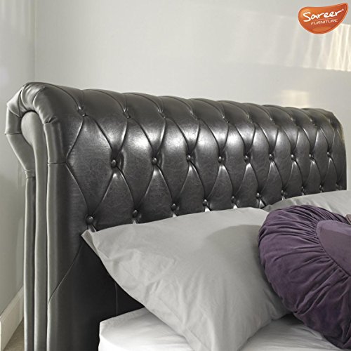 Dimension: W: 1465 x L: 2350 x H 1025 mmMake a style statement with this handcrafted bed frame showcasing a classic sleigh design with faux leather upholstery. Complete with button-tufted detailing it effortlessly enhances both classic and contemporary schemes. - Mattress Not Included - Faux Leather Finish - Button Tufted Detailing - Classic Sleigh Design - Solid Wooden Feet