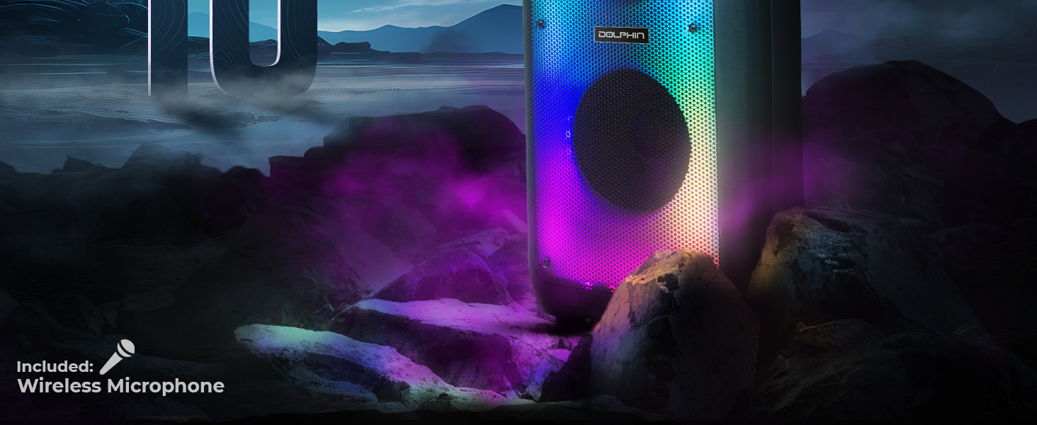 Dolphin's SP-1070RBT is a big and heavy party speaker. It's about three feet tall and weighs almost 40 lbs. It has tiny wheels and an integrated handle, but it won't roll easily on anything other than a smooth surface.The sound that comes out of this heavy-duty ABS box is really impressive. You can actually feel the bass through the floor!Midrange is abundant and highs are crisp from a top-mounted tweeter. There are various light modes, some respond to the music. You can tailor the sound with a five-band eq or use one of the presets. Input options include Bluetooth, FM radio, USB and SD card reader, guitar, mic and Aux input jacks.With the included remote you can adjust volume, input, track/station and eq from across the room.Power is supplied with the included AC cable. You can also use the built-in rechargeable battery or an external 12-volt power source with the included 12-volt power cable. A wireless mic comes in the package. It uses two AA batteries, not included.Bottom line: At nearly 40 lbs. the Dolphin SP-1070RBT pushes the limits of portability. The reward is getting the kind of deep powerful sound that you would expect from a quality home stereo plus a great light show to boot, recommended.